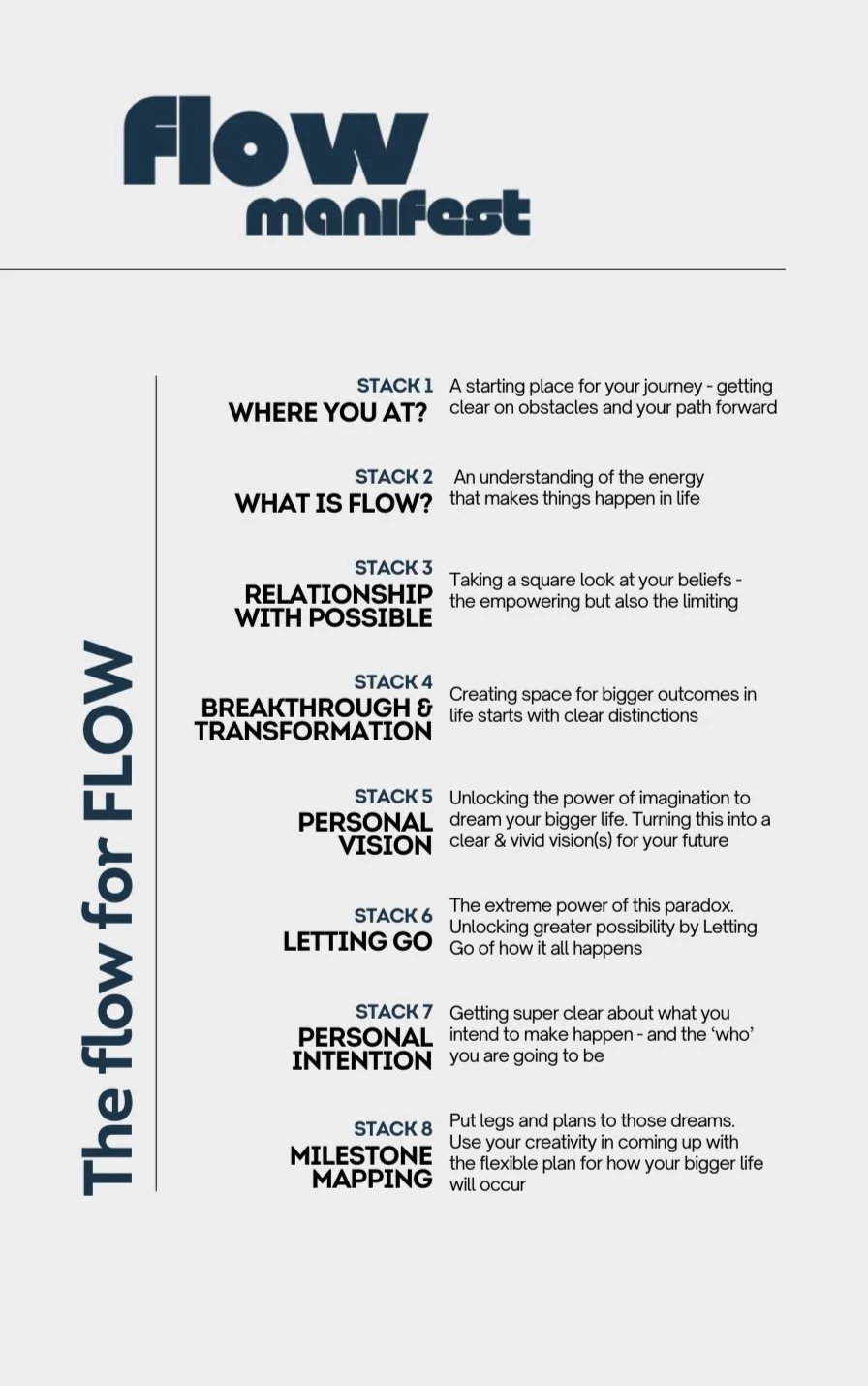 The FLOW Manifest Program is a transformative personal and professional development system designed to help individuals and teams break free from limitations, harness their creativity, and manifest the lives and outcomes they most desire.